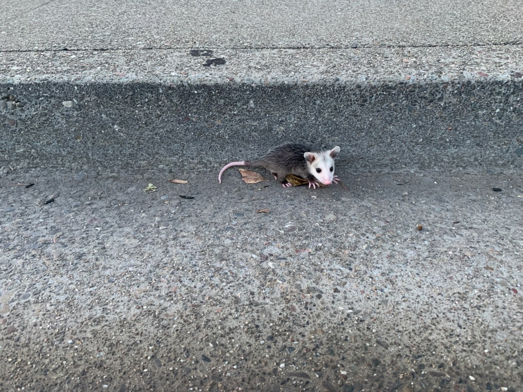 On a slow Sunday evening, my dad managed to drag me out of the house to go for a walk in the neighborhood. As we walked, I happened to bring up the topic of wild animals, and how we never saw any in the suburban areas. So of course, immediately after I said that, I nearly tripped over a baby opossum next to the sidewalk. The poor thing was shivering in cold and fear, and seemed pretty helpless and alone so we decided to help it out.